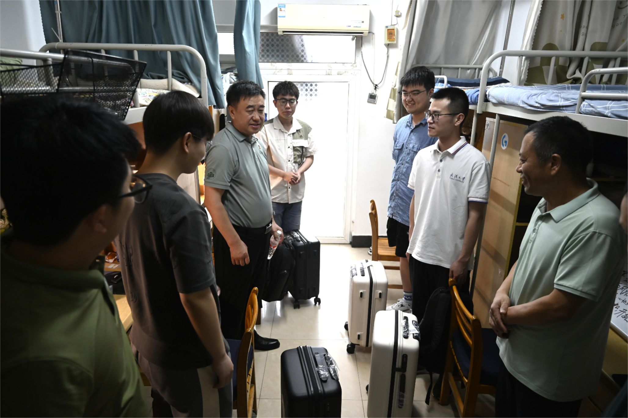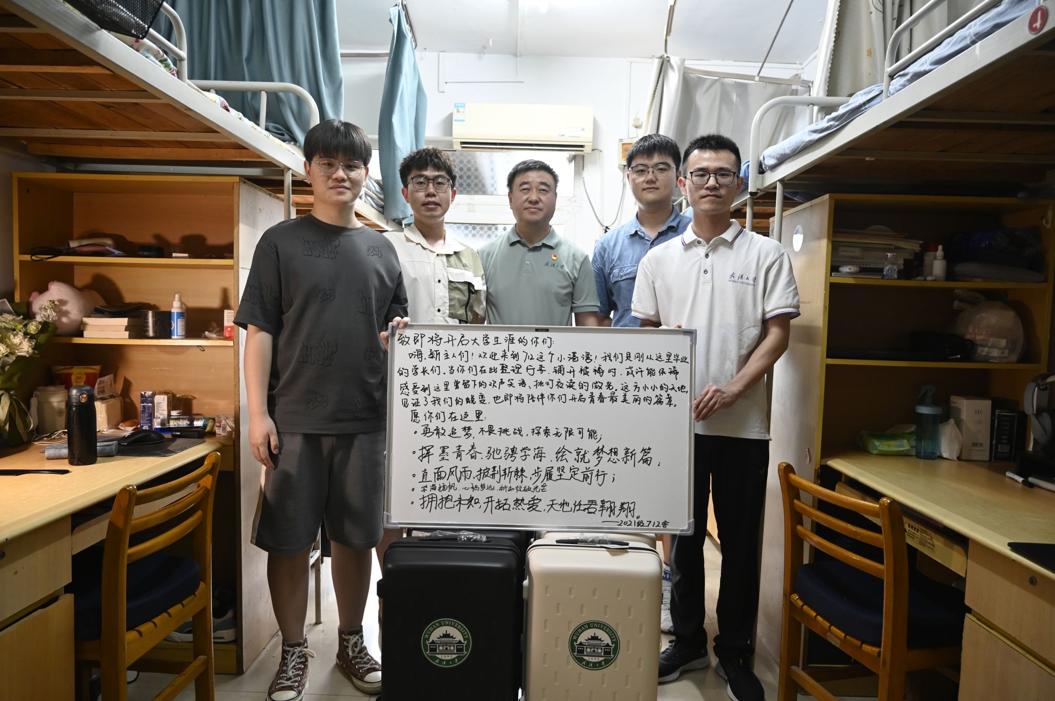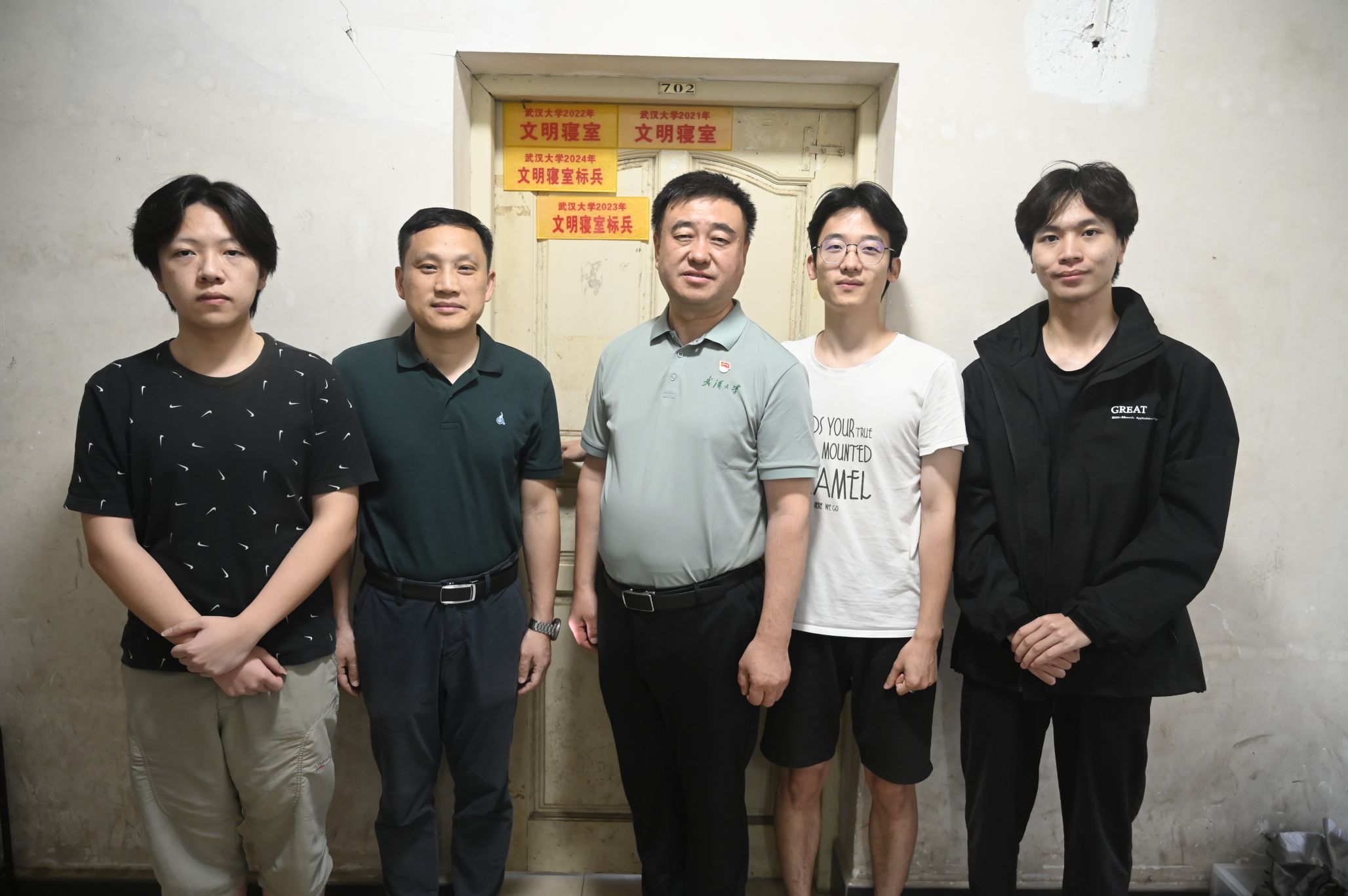 在走访学生宿舍过程中,屈文谦亲切地与毕业生交谈,仔细询问同学们的毕业去向,对毕业生们所取得的成绩表示祝贺,并为他们送上了学校精心准备的毕业纪念品,表达了母校对同学们深深的祝福与期许。信息学部16舍702的4位同学全部成功推免,连续四年获评“武汉大学文明寝室”,连续两年获评“武汉大学文明寝室标兵”,屈文谦一行对寝室文化建设给予充分肯定,指出了宿舍氛围和风气的重要性。
