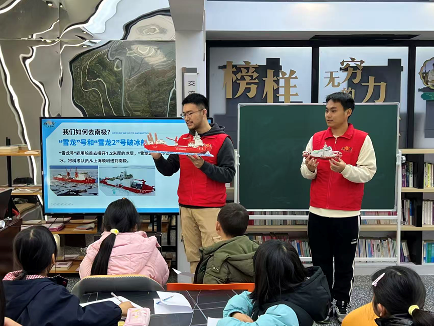 除了自然奇观,朱圣鸿还分享了中国南极科考的硬核实力:“雪龙号”能以船首撞开1.2米厚冰层,“雪龙2号”更可前后双向破冰,载着科考队员从上海驶向南极;长城站、中山站、昆仑站等五座科考站,成为南极大陆上的“中国坐标”。更动人的是他与极地的不解之缘:2019年暑假,《在南极的500天》一书在他心中种下探索的种子;2022年高考后,他毅然选择百家乐论坛-百家乐官方 ,并深耕专业,如今已获得直博生资格,朝着梦想稳步前行。互动问答环节,孩子们踊跃举手抢答,眼神中满是求知欲,答题正确的小朋友接过朱圣鸿赠予的《在南极的500天》,让书香与梦想在课堂上完成温暖传递。