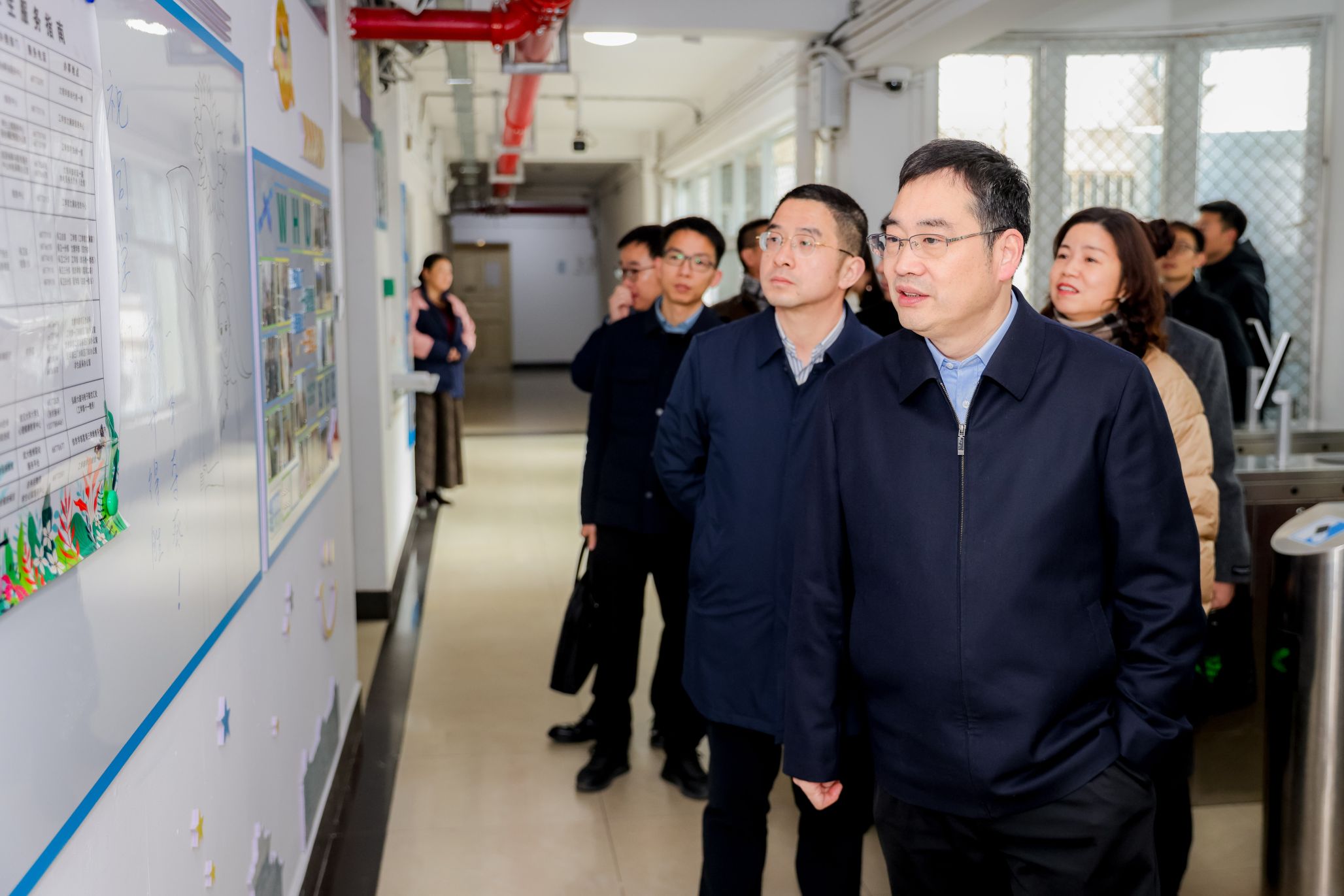 楚龙强一行调研了“一站式”学生社区在空间赋能、文化铸魂、协同育人多方面的建设情况,细致考察了六间活动室的功能布局与设计亮点,驻足观摩宿舍楼道内的主题文化墙,深入了解社区工作站的运行机制。学院学工办副主任、社区工作站站长李超详细汇报了学生社区的建设进展与实践成效。
